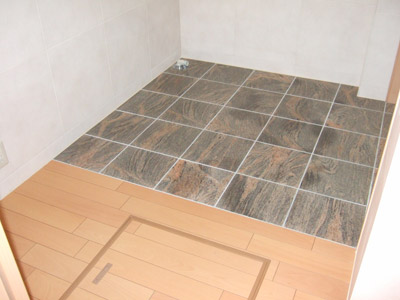 脱衣室の床は濡れても大丈夫な石貼、床暖房付。