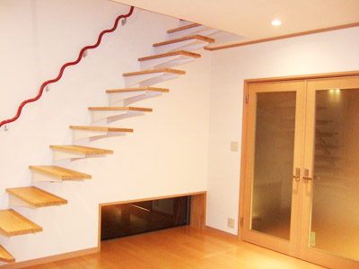 人間工学から生まれたクネット手すりはどんな角度でも手になじみます。壁には片持ちの階段がついています。